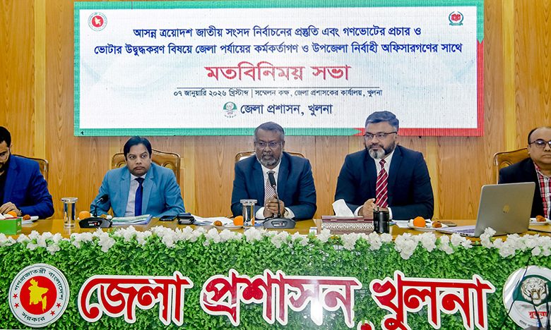 আহছানুল আমীন জর্জ, খুলনা ব্যুরো প্রধান : আসন্ন ত্রয়োদশ জাতীয় সংসদ নির্বাচনের প্রস্তুতি ও গণভোটের প্রচার এবং ভোটারদের উদ্বুদ্ধকরণ বিষয়ে এক মতবিনিময় সভা ৭ জানুয়ারী (বুধবার) সকালে খুলনা জেলা প্রশাসকের সম্মেলনকক্ষে অনুষ্ঠিত হয়। সভায় প্রধান অতিথি ছিলেন জনপ্রশাসন মন্ত্রণালয়ের যুগ্মসচিব মোহা: আলমগীর হোসেন।
