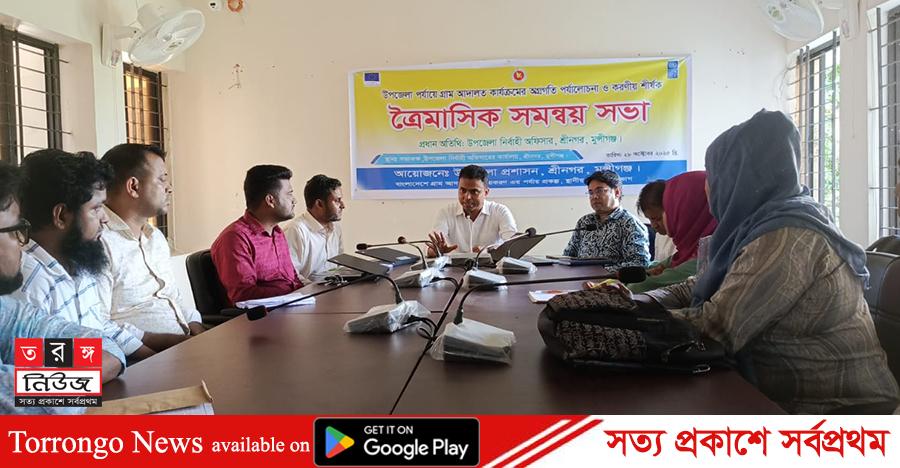 আরিফুল ইসলাম শ্যামল: মুন্সীগঞ্জের শ্রীনগরে উপজেলা পর্যায়ে গ্রাম আদালত কার্যক্রমের অগ্রগতি পর্যালোচনা ও করণীয় শীর্ষক ত্রৈমাসিক সমন্বয় সভা হয়েছে। মঙ্গলবার বেলা ১১টার দিকে উপজেলা নির্বাহী অফিসারের সভাকক্ষে এই সভা অনুষ্ঠিত হয়।