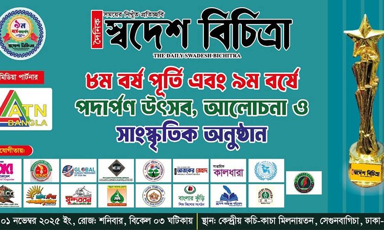 সময়ের নির্ভরযোগ্য প্রতিচ্ছবি দৈনিক স্বদেশ বিচিত্রা তার ৮ম বর্ষপূর্তি ও ৯ম বর্ষে পদার্পণ উপলক্ষে আয়োজন করেছে এক অনন্য আলোচনা সভা, সাংস্কৃতিক অনুষ্ঠান ও গুণীজন সংবর্ধনা।