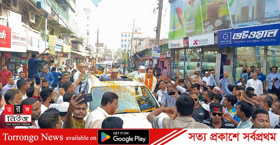 প্রায় দুই কিলোমিটার দীর্ঘ লাইনে ফুলেল শুভেচ্ছা জানান নেতাকর্মীরা। ধানের শীষের স্লোগান স্লোগানে মুখরিত হয়ে উঠে ভোলার রাজপথ।