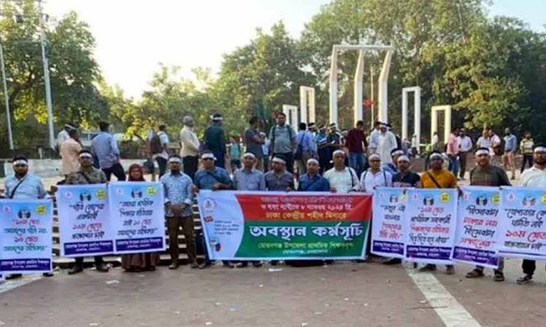 ৩ দাবিতে শহীদ মিনারে প্রাথমিক শিক্ষকদের অবস্থান