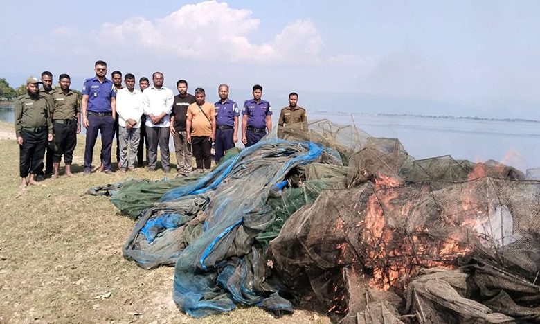 টাঙ্গুয়ার হাওরে পাঁচ লাখ টাকার জাল পুঁড়িয়ে ধ্বংস