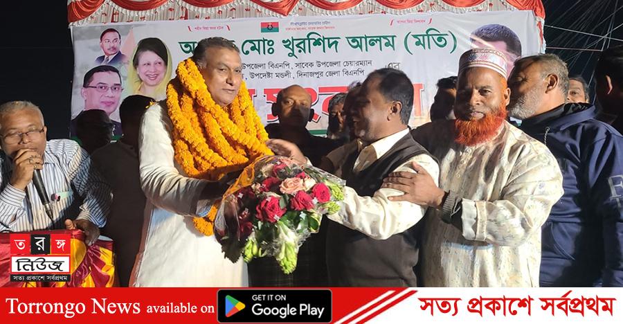এরপূর্বে দুপুর দুইটায় ফুলবাড়ী উপজেলা বিএনপির সভাপতি অধ্যক্ষ খুরশিদ আলম মতি ঢাকা থেকে সৈয়দপুর বিমান বন্দরে পৌছালে তাকে বরণ করতে হাজার হাজার নেতা-কর্মী সমর্থকরা সেখানে উপস্থিত হয়ে তাকে ফুলেল শুভেচ্ছা দিয়ে বরণ করেন। এর পর এক বিশাল মটরসাইকেল শোভা যাত্রা দিয়ে তাকে ফুলবাড়ীতে নিয়ে আসা হয়। ফুলবাড়ী পৌর শহরের উর্বসী মোড়ে এক খোলা স্টেজে তাকে ফুলেল শুভেচ্ছা বিনিময় করেন নেতা-কর্মিসহ বিভিন্ন শ্রনী পেশার মানুষ।