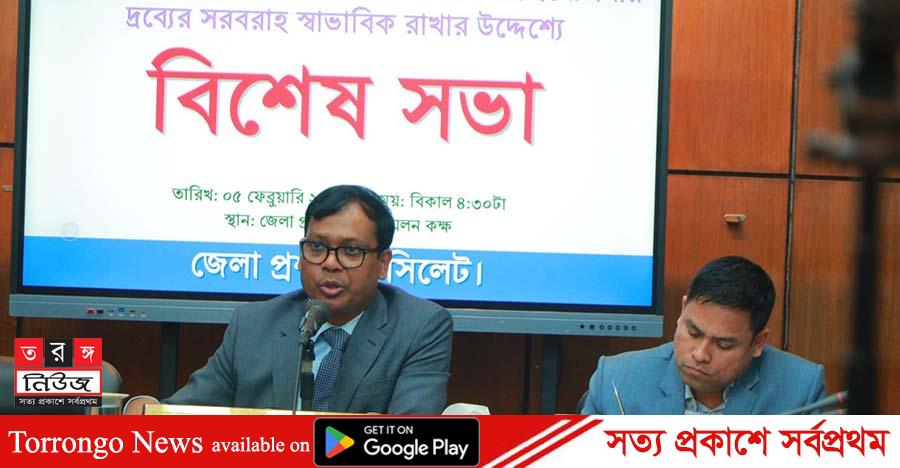 জেলা প্রশাসক আজ(৫ ফেব্রুয়ারী) বৃহস্পতিবার বিকেলে আসন্ন রমজান উপলক্ষে সিলেট জেলায় নিত্যপ্রয়োজনীয় দ্রব্যের সরবরাহ স্বাভাবিক রাখার উদ্দেশ্যে জেলা প্রশাসন আয়োজিত এক বিশেষ সভায় সভাপতির বক্তব্যে এসব কথা বলেন।সিলেটের অতিরিক্ত জেলা প্রশাসক (উন্নয়ন ও মানবসম্পদ ব্যবস্থাপনা) পদ্মাসন সিংহের পরিচালনায় জেলা প্রশাসক কার্যালয়ের সম্মেলন কক্ষে অনুষ্ঠিত সভায় আরো বক্তব্য রাখেন,সিলেট প্রেসক্লাবের সাবেক সভাপতি ইকরামুল কবির,সিলেট অনলাইন প্রেসক্লাবের সভাপতি গোলজার আহমদ হেলাল,সিলেট মহানগর ইমাম সমিতির সভাপতি মাওলানা হাবিব আহমদ শিহাব প্রমুখ।সভায় সরকারি বিভিন্ন দপ্তরের কর্মকর্তাবৃন্দ,পুলিশের প্রতিনিধি, ব্যবসায়ী নেতৃবৃন্দ ও সাংবাদিকগণ উপস্থিত ছিলেন।