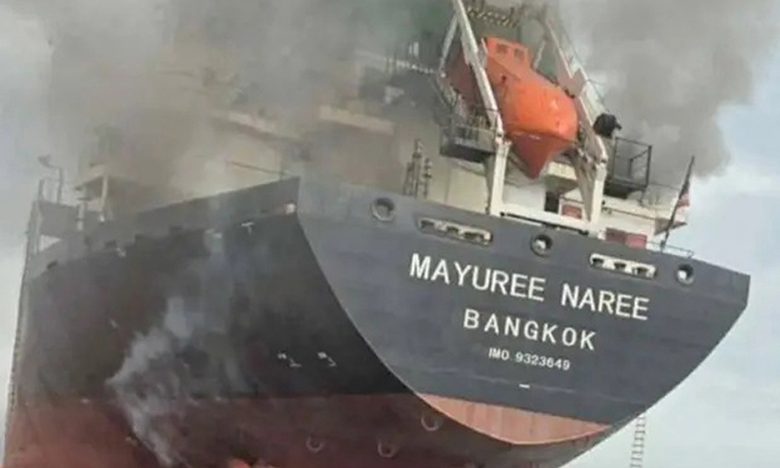 একটি ছবিতে ব্যাংককের মালবাহী জাহাজে আগুন জ্বলতে দেখা গেছে।