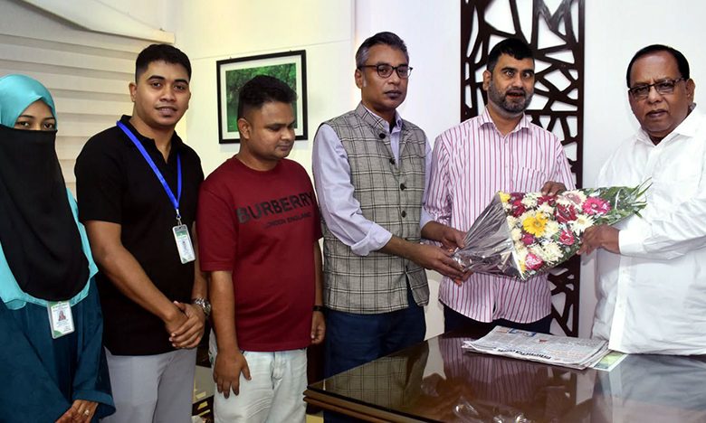 সৌজন্য সাক্ষাৎকালে সিলেট জেলা পরিষদের প্রশাসক আবুল কাহের চৌধুরী শামীম-কে ফুলের তোড়া দিয়ে শুভেচ্ছা জানান জিডিএফ’র মহাসচিব ও নির্বাহী পরিচালক বায়জিদ খান সহ প্রতিষ্ঠানের নেতৃবৃন্দ।