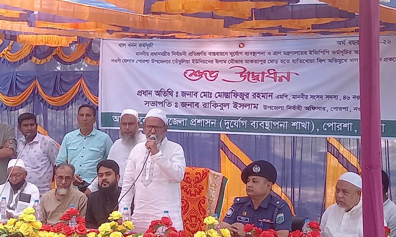 উপজেলা নির্বাহী অফিসার রাকিবুল ইসলামের সভাপতিত্বে প্রধান অতিথির বক্তব্যে তিনি বলেন, ‘শহীদ প্রেসিডেন্ট জিয়াউর রহমান দেশব্যাপী কৃষি উৎপাদন বাড়াতে স্বেচ্ছাশ্রমে খাল খনন কর্মসূচি গ্রহণ করেছিলেন। দীর্ঘ সময় পর আবারও তারই সুযোগ্য সন্তান প্রধানমন্ত্রী তারেক রহমানের নির্বাচনী প্রতিশ্রুতি বাস্তবায়নে দেশব্যাপী খাল খননের কর্মসূচি গ্রহণ করেছেন। এরই ধারাবাহিকতায় পোরশা উপজেলা প্রশাসন দুর্যোগ ব্যবস্থাপনা শাখার আয়োজনে এই খাল খননের কাজ শুরু হলো। পর্যায়ক্রমে আরও খাল খনন করা হবে।’