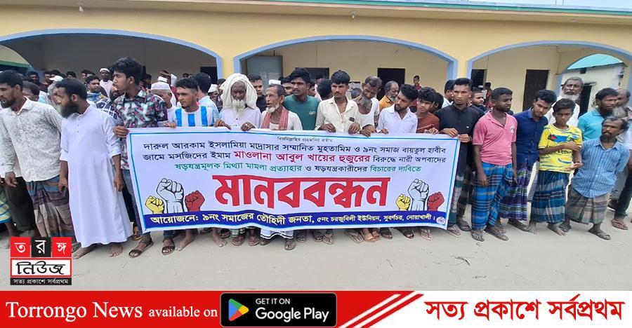 নোয়াখালী প্রতিনিধি: নোয়াখালীর সুবর্ণচরের দারুল আরকাম ইসলামিয়া মাদরাসার প্রধান শিক্ষক মো.আবুল খায়েরের (৩৫) বিরুদ্ধে শ্লীলতাহানির অভিযোগকে “ষড়যন্ত্রমূলক” দাবি করে মামলা প্রত্যাহার ও সংশ্লিষ্টদের বিচারের দাবিতে মানববন্ধন করেছেন স্থানীয় বাসিন্দারা।