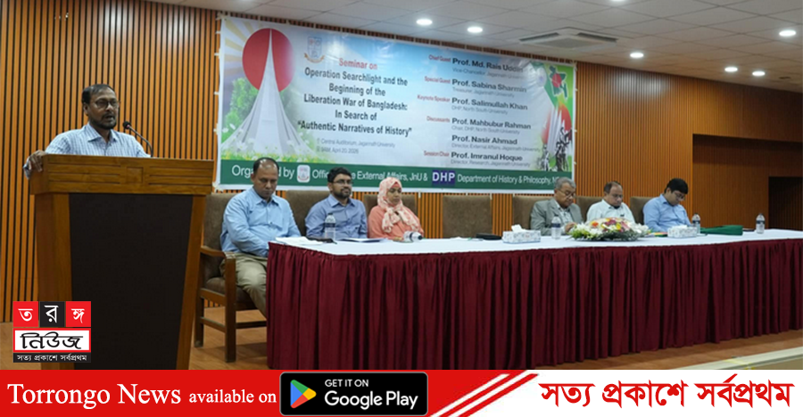 জবি প্রতিনিধি, রাফীদ আদ দ্বীন রাঈম: জগন্নাথ বিশ্ববিদ্যালয়ে (জবি) ‘অপারেশন সার্চলাইট ও বাংলাদেশের মুক্তিযুদ্ধের সূচনা: ইতিহাসের প্রামাণ্য আখ্যানের সন্ধানে’ শীর্ষক একটি সেমিনার অনুষ্ঠিত হয়েছে। সোমবার (২০ এপ্রিল ২০২৬) সকাল ৯টা ৩০ মিনিটে বিশ্ববিদ্যালয়ের কেন্দ্রীয় মিলনায়তনে এক্সটার্নাল অ্যাফেয়ার্স এবং নর্থ সাউথ বিশ্ববিদ্যালয়ের ইতিহাস ও দর্শন বিভাগের যৌথ আয়োজনে এ সেমিনার অনুষ্ঠিত হয়।