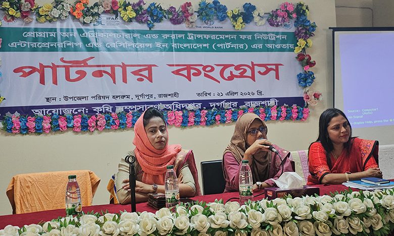 জাহিদুল ইসলাম দু্‌র্গাপুর (রাজশাহী) প্রতিনিধিঃ রাজশাহীর দুর্গাপুর উপজেলায় কৃষি ও গ্রামীণ রূপান্তরের মাধ্যমে পুষ্টি, উদ্যোক্তা সৃষ্টি এবং সহনশীলতা (রেজিলিয়েন্স) বৃদ্ধির লক্ষ্যে ‘পার্টনার কংগ্রেস’ অনুষ্ঠিত হয়েছে। মঙ্গলবার সকাল ১০টায় উপজেলা হলরুমে আয়োজিত এ কংগ্রেসে কৃষির আধুনিকায়ন ও পুষ্টি নিরাপত্তা নিশ্চিতকরণে কার্যকর উদ্যোগের ওপর গুরুত্বারোপ করা হয়। ‘পার্টনার প্রোগ্রাম অন এগ্রিকালচার অ্যান্ড রুরাল ট্রান্সফরমেশন ফর নিউট্রিশন, এন্টারপ্রেনরশিপ অ্যান্ড রেজিলিয়েন্স ইন বাংলাদেশ (পার্টনার)’ এর আওতায় দুর্গাপুর কৃষি সম্প্রসারণ অধিদপ্তর এই আয়োজন করে।