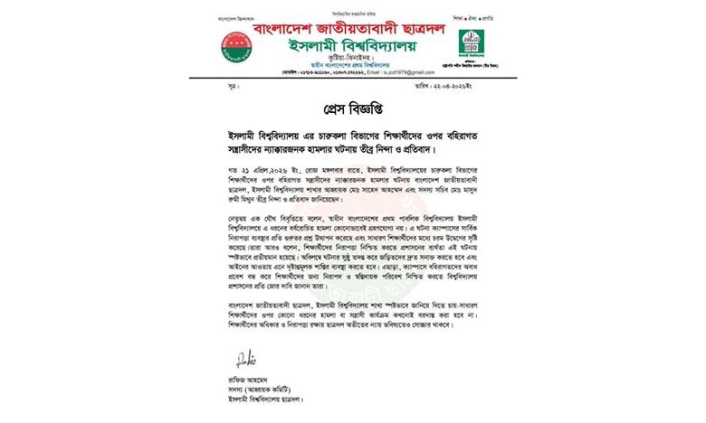 বিজ্ঞপ্তিতে ইবি শাখা ছাত্রদলের আহ্বায়ক মো. সাহেদ আহম্মেদ এবং সদস্য সচিব মো. মাসুদ রুমী মিথুন এক যৌথ বিবৃতিতে এই হামলার ঘটনায় জড়িতদের দ্রুত শাস্তি ও ক্যাম্পাসকে বহিরাগতমুক্ত করার জোর দাবি জানান।